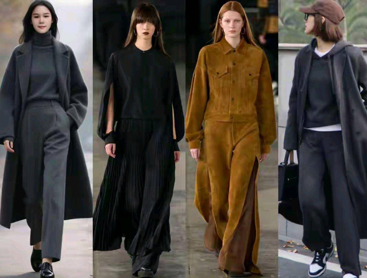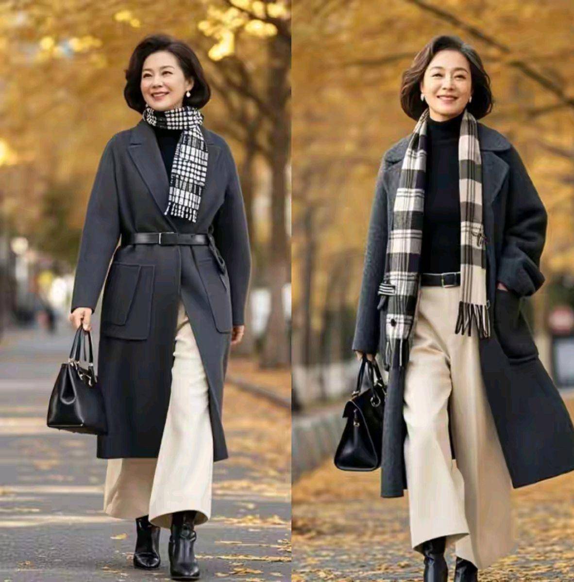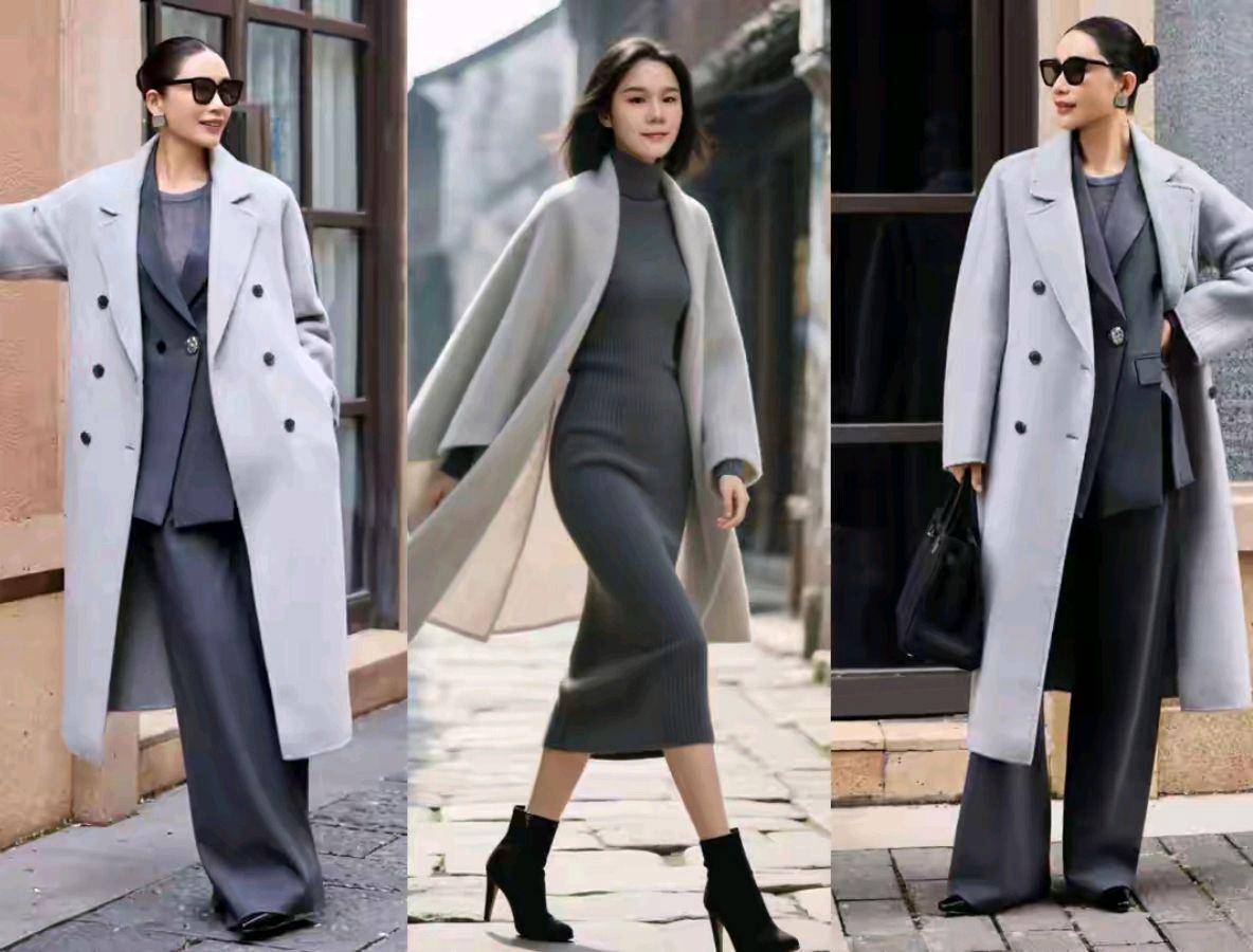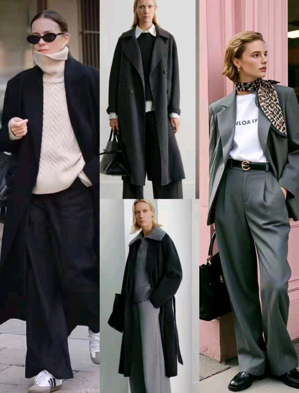 对于职场或喜欢极简穿搭的女性,选择无彩色系搭配,是明智选择。如灰色大衣内搭黑色高领打底衫,下装搭配白色阔腿裤,鞋子和包包也选择黑色,整体简约大气又高级。