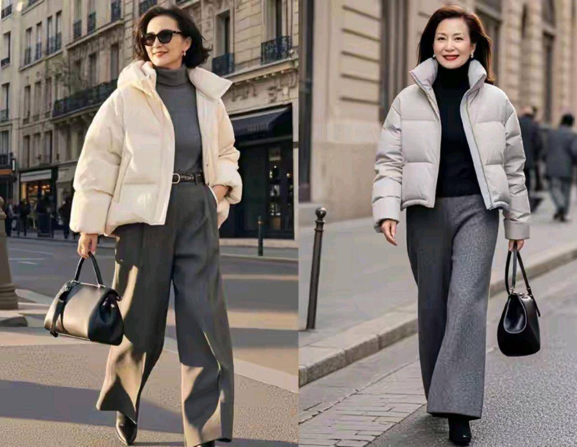 如内搭选择灰色或黑色高领打底衫,下装搭配灰色直筒裤,高跟靴拉长腿部线条。出外穿上浅灰色或米色短棉服,显瘦显高又减龄。