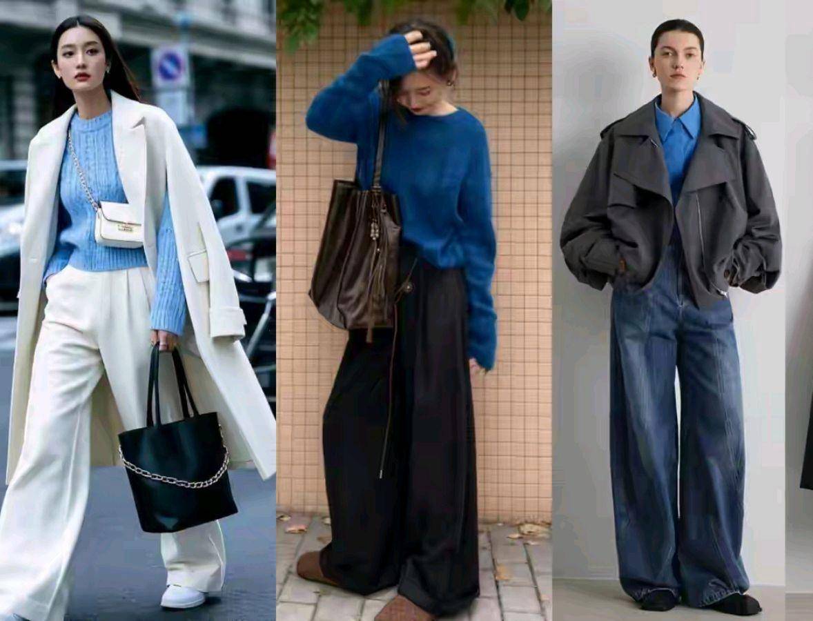 如浅蓝色,给人清爽明亮感,而深蓝或藏蓝,则有一定的显瘦视觉效果,而宝藏色,艳丽吸睛又高级。秋冬季节,选择无彩色服装和蓝色服装搭配,能让造型呈现出一种高级利落感。