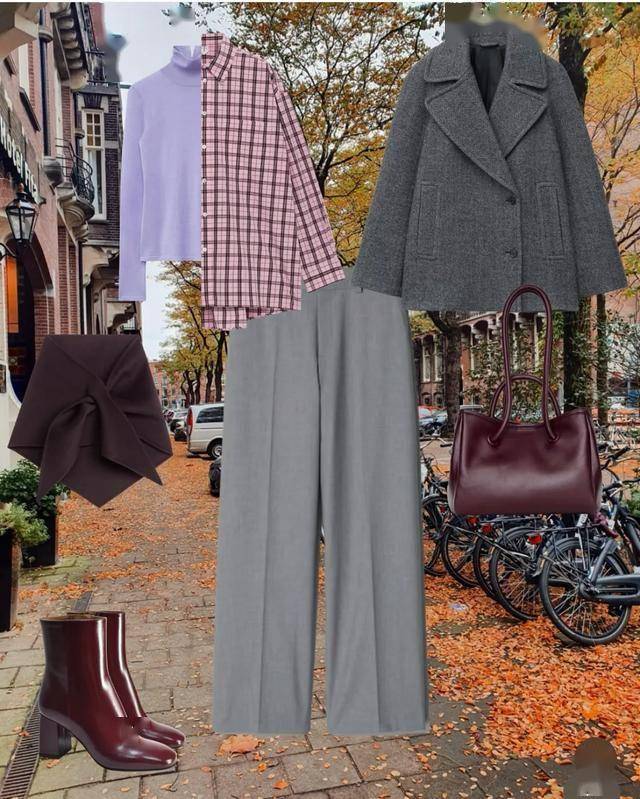 酒红、深灰的颜色不能少,毛呢外套,半裙还有短靴则是加分项。先用直线版型的浅灰外套,搭配丁香紫毛衫或粉格衬衫,暗擦擦的灰色西装也有了活泼感。