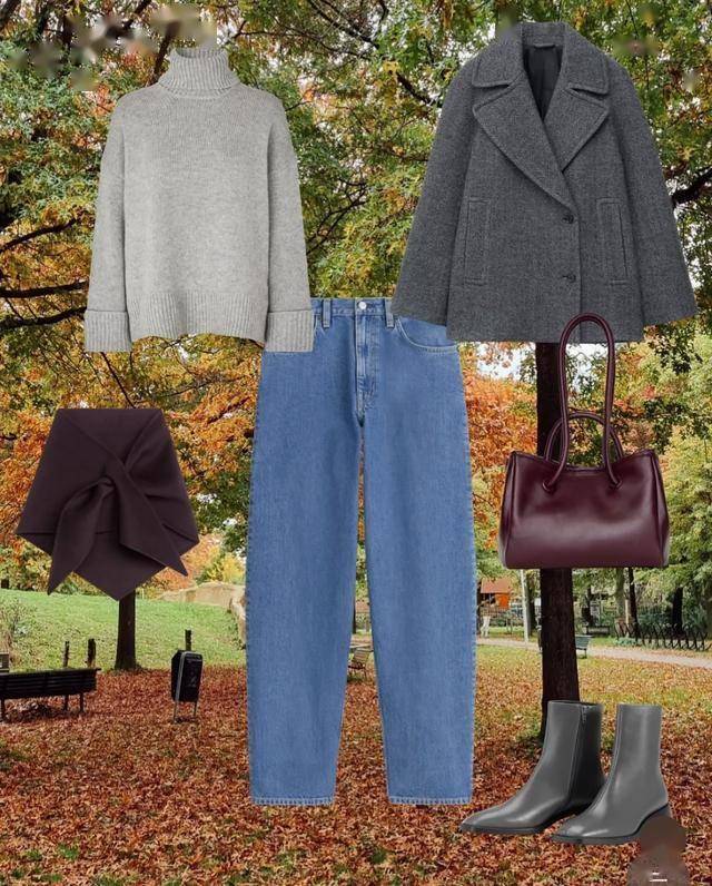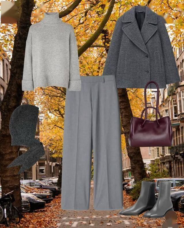 保持一身高级感的小秘密,是把灰色深浅不同的罗列开来,由浅到深的灰色层次感,从内搭毛衫一直到脚踝靴都细心照顾到,只用酒红单肩包提亮,在黄叶纷纷到街头行走,美得很干净。