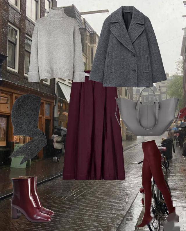 成熟又有魅力的姐妹,就是要好好穿酒红色,一条半裙再配同色系丝袜,把迷人感大胆穿出来,再用粉格衬衣配灰色呢子外套,有色彩更有温度。