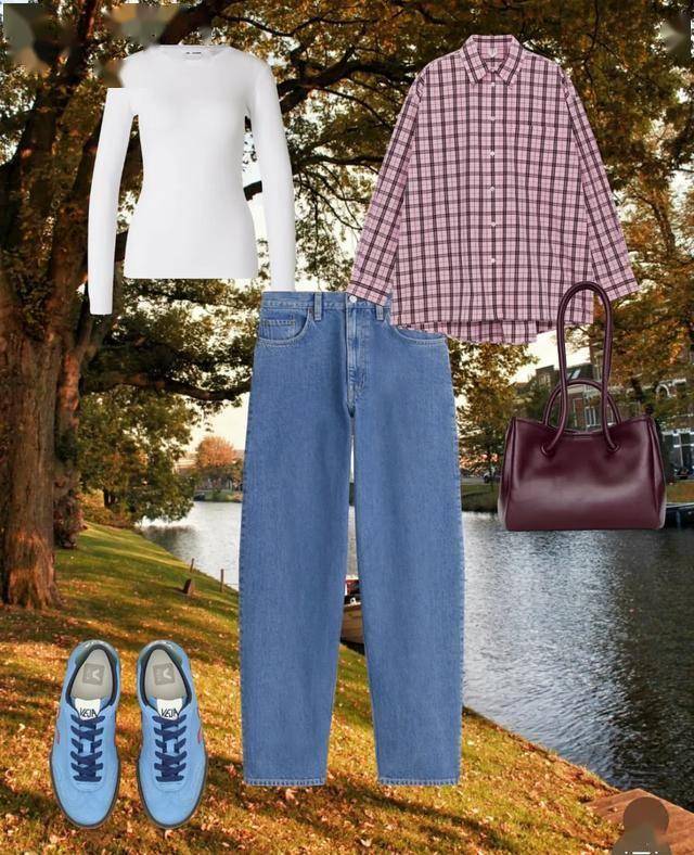 白T和牛仔裤的组合打底,让宽松的格纹再次登场,柔粉色让格纹少了些刻板还多了显白的效果,穿双轻便平底鞋,秋日露营穿这一身刚好。