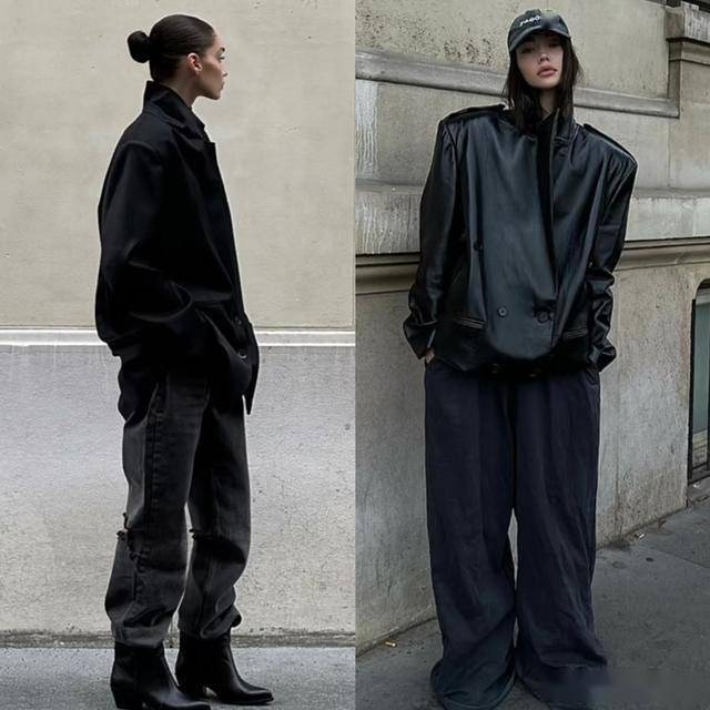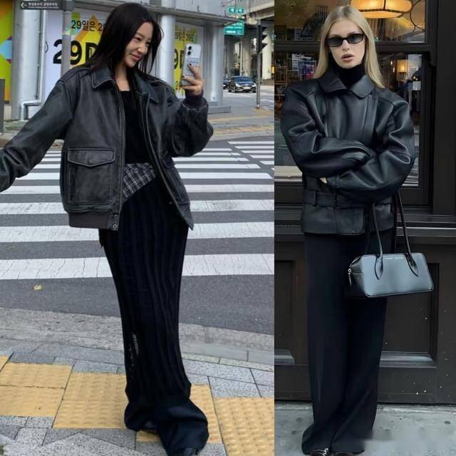 今年秋冬蛮流行复古风的,黑色皮夹克算是最热闹的单品了,可以搭配一条黑色的拖地阔腿裤来穿,单一配色本来就是视觉顺延感,加上黑色更增加了收敛效果,显瘦显高又高级。