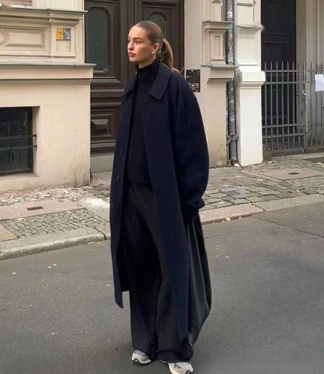 想要穿得体面高级,又想要有女人味,可以尝试黑色大衣里搭配黑色长裙来穿,配上黑色的猫跟鞋,整体会有一种特别优雅知性的魅力,而且非常精致。