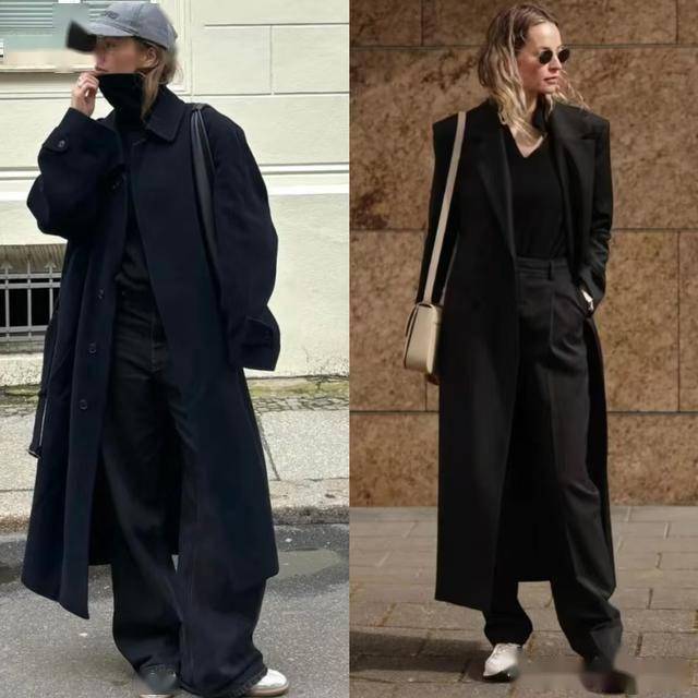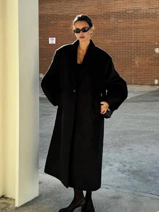冬天我们穿长款外套的机会比较多,可以给自己准备一件黑色大衣,酷感十足,又显瘦显高。