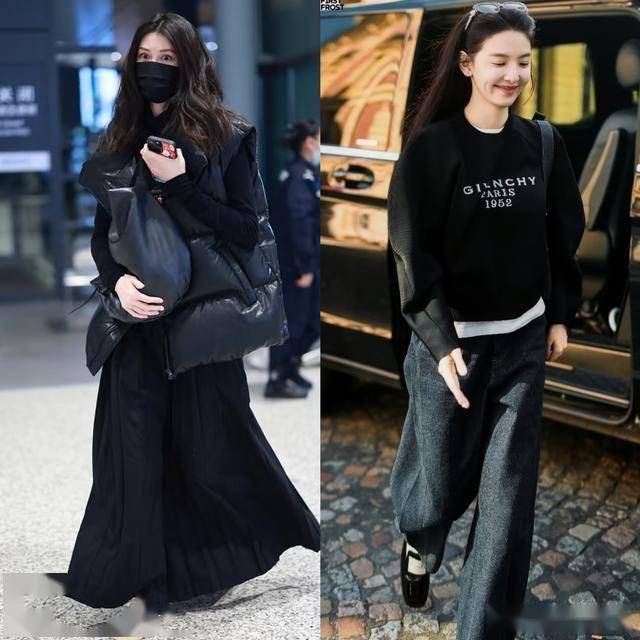 黑色短羽绒马甲,搭配了长款的黑色百褶裙,黑色长裙的飘逸垂坠感巨显瘦,又很有女人味,而短羽绒则保暖又可爱,搭配起来很好看。