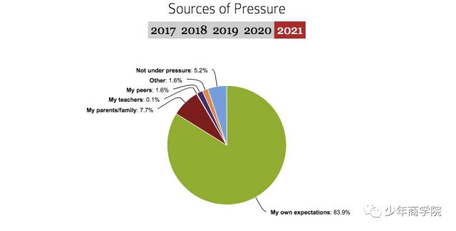 结果呈一边倒的趋势——83.9%的同学压力来源是自我期望,来自于家长老师的仅仅占了7.8%。这意味着,来自内在的驱动力远远比外力更有效。