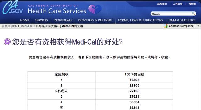官网公布:申请“加州白卡”Medi-Cal的收入标准