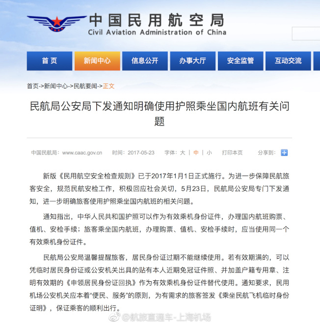 中国民航局公安局23日发公文,明确表示,中国护照可以作为有效乘机身分证件。(网页截图)