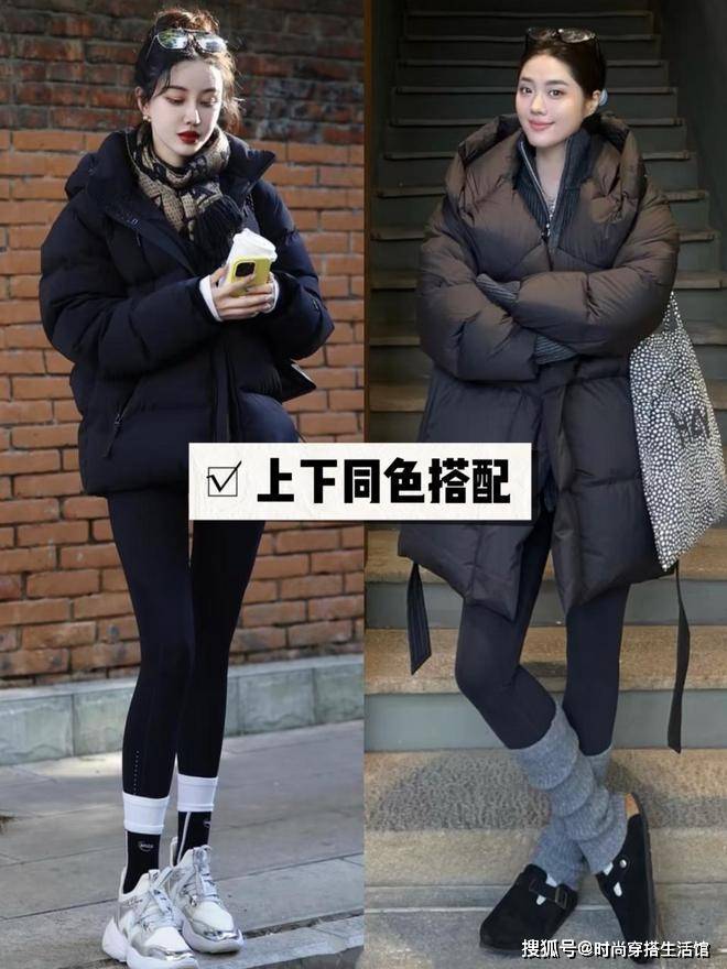 比如我们可以选择羽绒服和无痕裤同色或者是无痕裤和鞋子同色,全身搭配的色彩只要不超过三种,视觉上就非常的显高显腿长,就算微胖女性也能轻松驾驭。