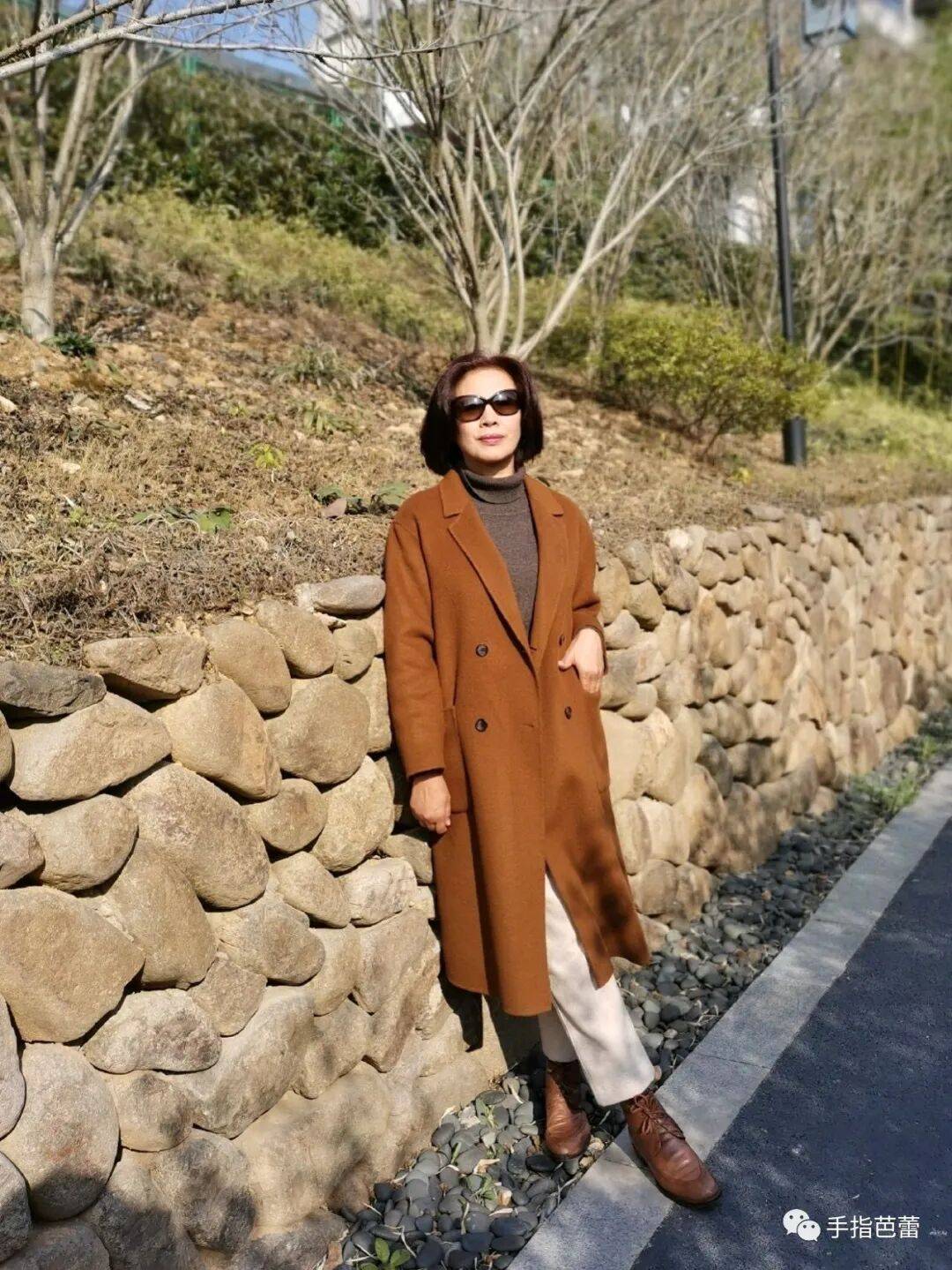 而色调较深的棕色大衣,则需要适当加深打底衫的色调,让深咖色上衣衬出大衣的色调光泽,同时用浅白色烟管裤,提升整体的色彩感,让穿搭变得鲜活且具有魅力,用棕色短靴承上启下,更具质感。