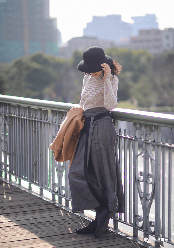 若你的裙装色调比较深沉,那就用浅亮色的上衣来搭配,提升穿搭的亮点细节,又构造清晰的比例感,无论是套上纯色大衣,亦或是随意的单穿,都不失该有的质感与时髦感,戴上一顶圆礼帽,化身摩登女人。