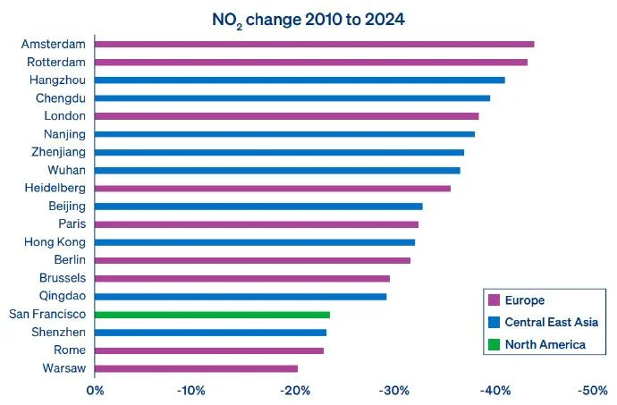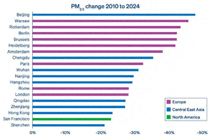 英国《卫报》近日发布的一项调查报告显示,根据对全球近百座城市的分析,在2010年至2024年间,全球有19个城市在空气质量方面取得“显著改善”,其中9个城市来自中国,伦敦、巴黎、柏林等9个欧洲城市榜上有名,旧金山则是唯一上榜的美国城市。报告称,19个上榜城市在过去15年间将空气中细颗粒物(PM2.5)和二氧化氮两种污染物含量降低了20%以上。报道称,北京在治理PM2.5方面名列前茅,污染水平降低了45%以上。其他上榜的中国城市有深圳、杭州、香港、成都、武汉、青岛、南京和镇江。报告重点列举了一些显著改善空气质量的行动案例,例如中国迅速从燃油汽车转向电动汽车、欧洲人口密集城市扩建自行车道、伦敦限制污染车辆等。