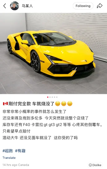 华人小哥砸80万全款拿下兰博基尼:还没见面就被烧没了