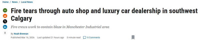 据卡尔加里先驱报报道,本周一(3月16日)凌晨,卡尔加里西南部一家豪车经销店发生猛烈的二级火警,大火过后,展厅里只剩下多辆高端汽车被烧成焦黑的残骸。消防人员在凌晨约4点30分接到“有轻微烟雾”的报警后赶到现场,在位于1A Street S.W. 5500号路段的一栋建筑内发现火势迅速蔓延。该建筑内有汽车改装店Tunerworks和高端车行Kulu Motorcar。目前尚不清楚当时建筑内共有多少辆车。