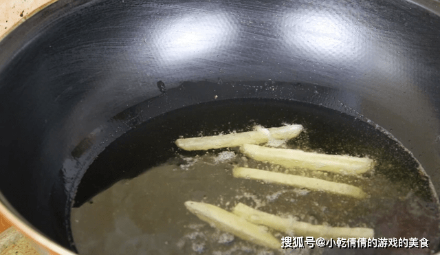 6、食用油温已经达到六成热之后就把土豆条一条一条地放进去开始炸,不要将它们一块全部放进去了,因为这样操作很容易使土豆条之间发生粘连,加入土豆条之后继续保持中火慢炸,不停地翻动,这样土豆条才能够受热均匀,炸至土豆条漂浮起来的时候,咱们开大火再炸一分钟就可以出锅装盘了。装盘之后在加上适量的番茄酱即可享受美味。