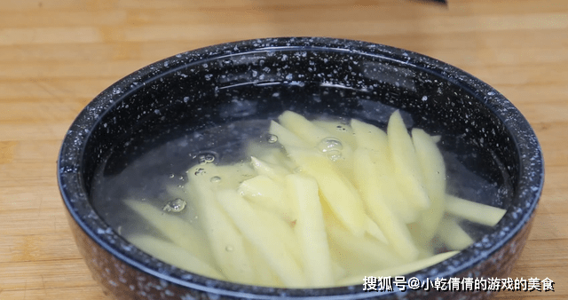3、冲洗完土豆之后将它沥干水分,放到案板上,先用刀切成薄片再切成长条,长条不要太粗,要稍微细一点,这样比较容易炸熟。土豆全部切完之后咱们将其放入清水中先抓洗一下,然后再放入白醋清洗一遍,这样会让土豆吃起来更加美味。