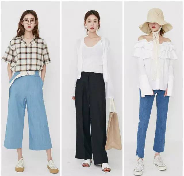 从阔腿裤到直筒裤、小脚裤,遵循上宽下紧或者上紧下宽的原则穿,一般不会出现太大的失误。