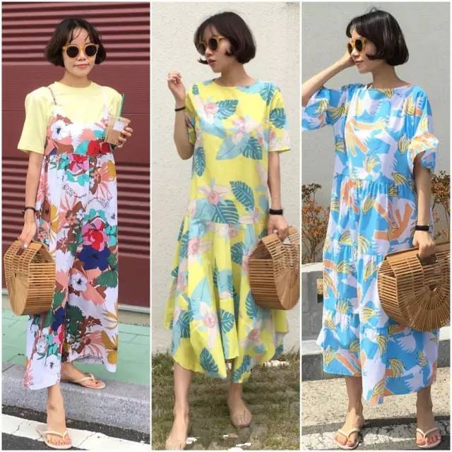 彩色系的印花在夏季也非常好看,肤色偏白的姑娘可以试试蓝、黄、粉系列的组合,有种度假的感觉,清新明快。