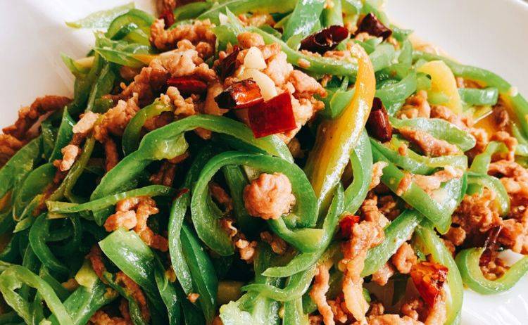 (5) 加入备好的猪肉丝,炒至猪肉变色,放入青椒、木耳,继续翻炒。