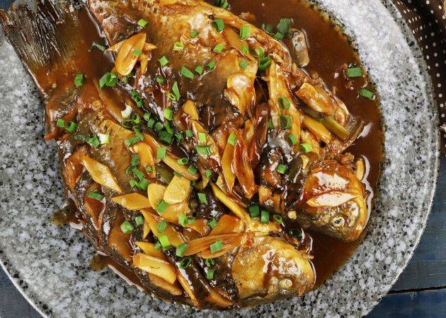 (7) 将鲫鱼盛出放入盘中,撒上香菜,一道色香味俱全的红烧鲫鱼就做好了。