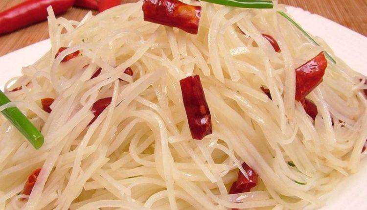 (3) 锅中加水烧开,白萝卜丝放入热锅中焯一遍,捞出,沥干水分,备用。