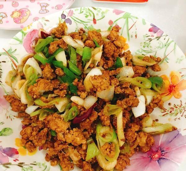 2.锅中放适量油,将剁碎的猪肉放入翻炒至变色,放入干辣椒及蒜粒拌炒,放适量生抽、料酒、盐、白糖及适量辣椒粉,拌炒入味,出锅前,放入葱段稍稍拌炒,撒少许香菜碎即可。