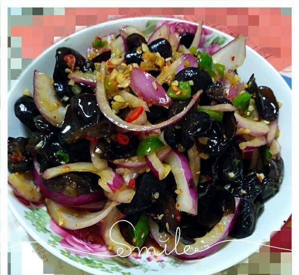用料:木耳10朵洋葱半个;醋2勺味极鲜1勺蒜末1瓣白芝麻适量朝天椒碎1个盐少许香油10滴糖半勺;