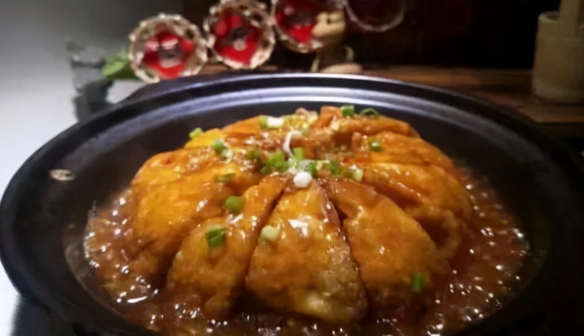 4.锅上火下入一勺高汤倒入调料,水淀粉勾欠,将豆腐扣入烧热垫上葱段的沙煲,淋上欠汁,洒上葱花即可。