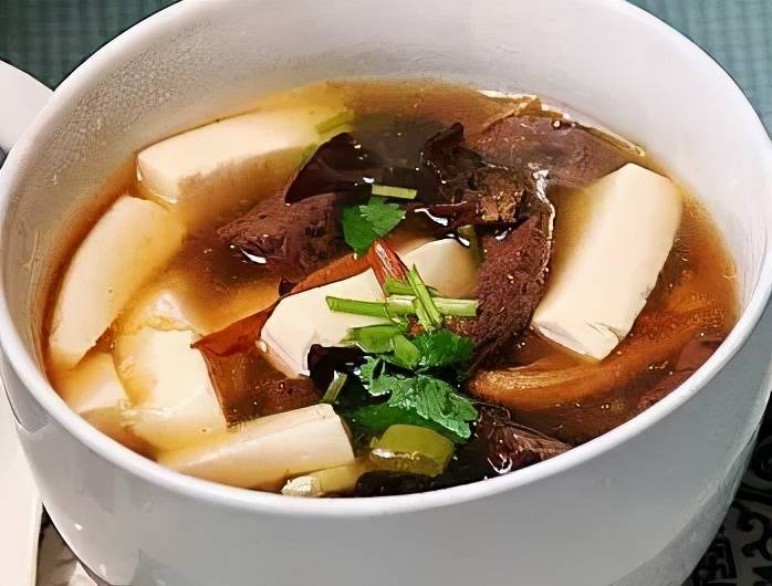 材料:鸭血150克、豆腐100克、泡发的木耳、黄花菜、葱、姜、盐、酱油15毫升、香醋15毫升、鸡精、胡椒粉、香菜