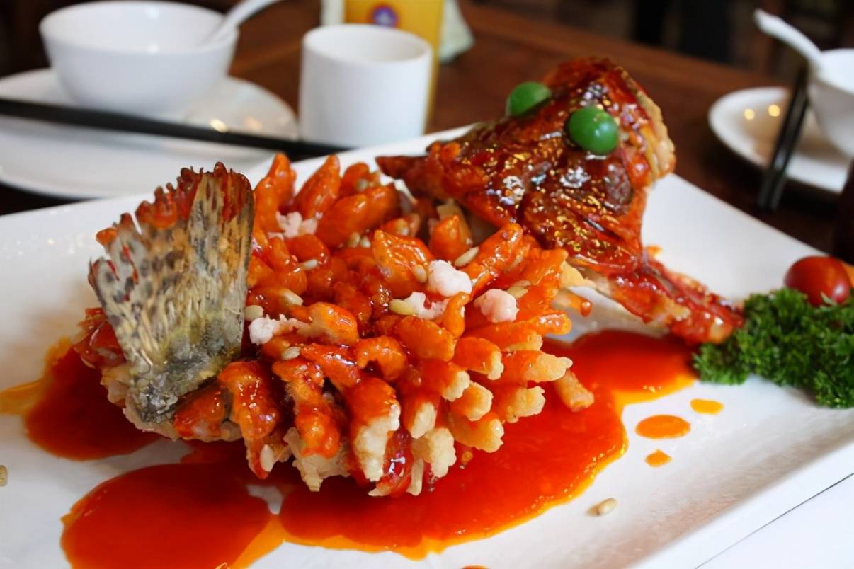 食材:桂鱼200克、 料酒2克、松子10克、胡椒粉少许、番茄酱10克、湿淀粉40克 、食盐适量、 食醋15克