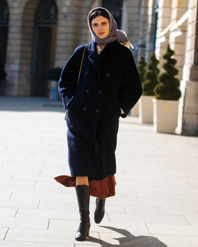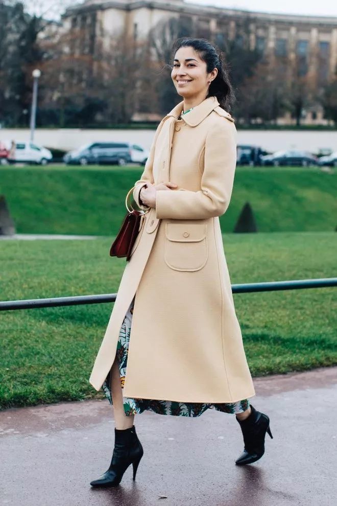 把大衣扣起来时,露出裙边更有风情,不容易被淹没在人群里。▼
