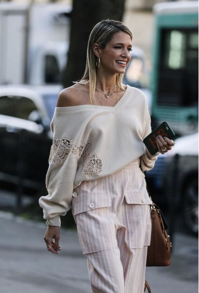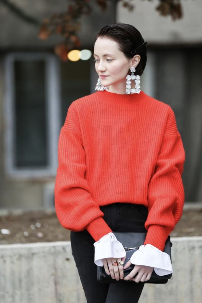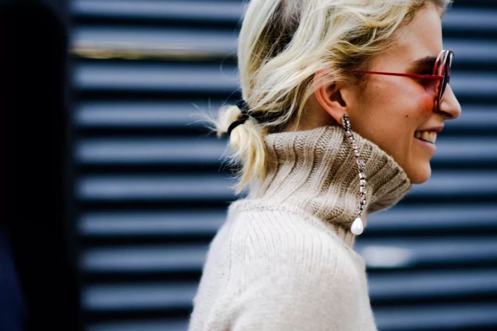 基本款的纯色毛衣,戴上夸张耳环,再露出一截袖子,造型立刻有了辨识度。▼