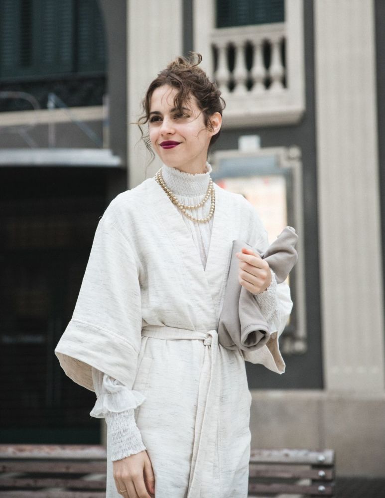 珍珠项链也很适合搭配一些女人味单品。 西班牙博主Saray Martin用它来搭配复古的小高领,外面再穿一件休闲风的罩衫,加上复古浓郁的红唇,美而不艳,优雅极了。▼