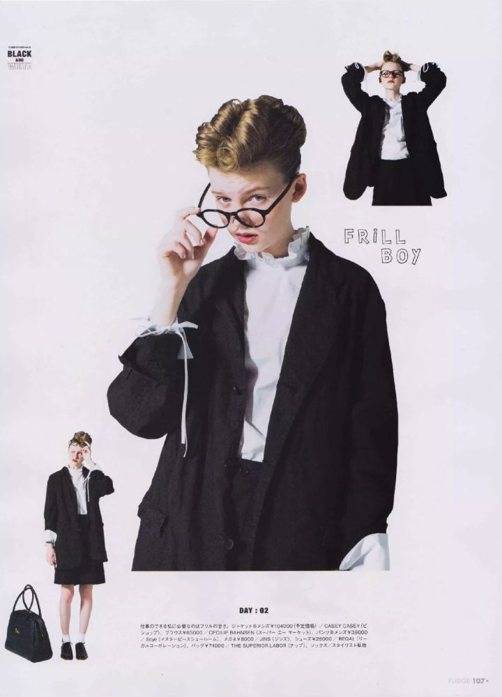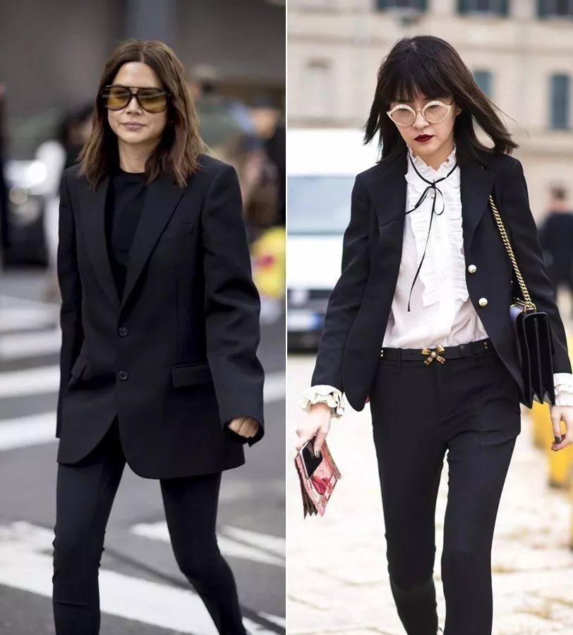 同样是黑色西装,一件拉夫领衬衫就能轻松化解它的古板和行政气息,穿出甜美的宫廷复古风。▼