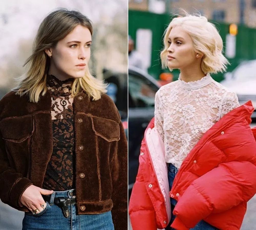 想要更有女人味,还可以换成蕾丝领试试。尤其适合穿在一些厚实的外套里,细腻的勾花浪漫又轻盈。▼