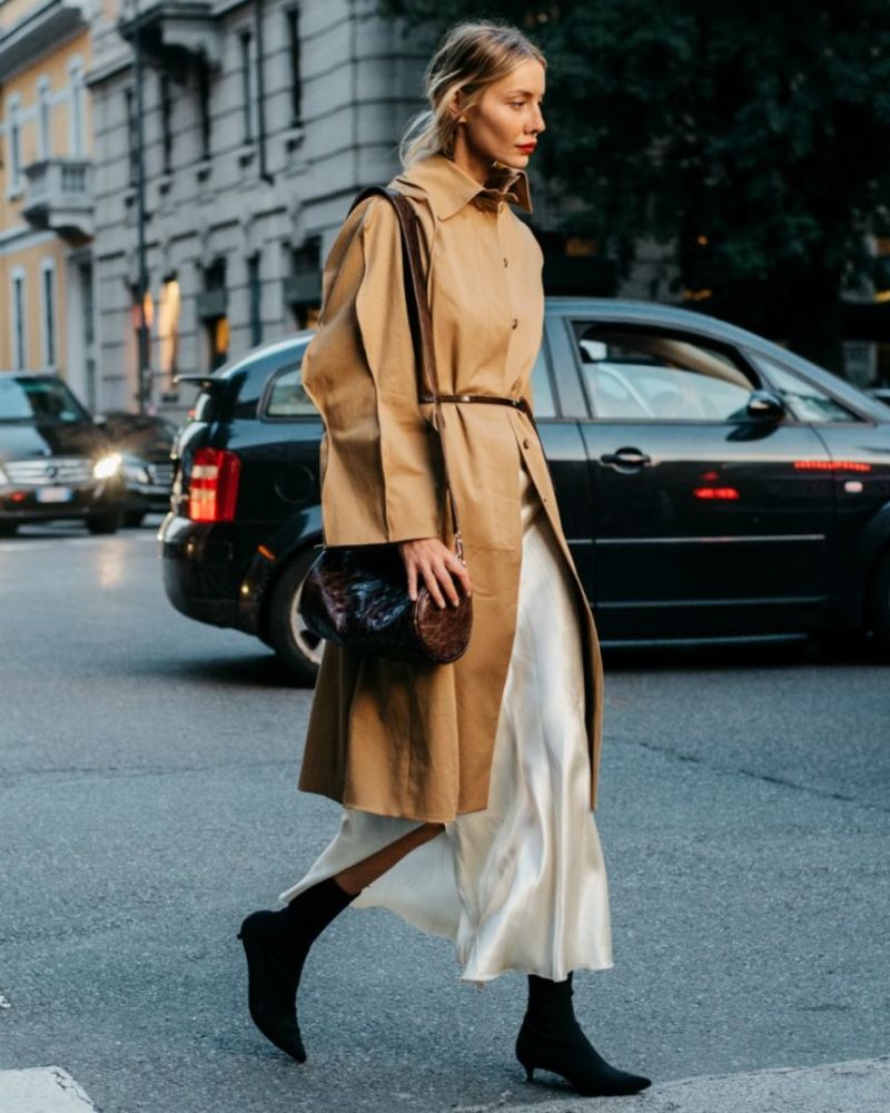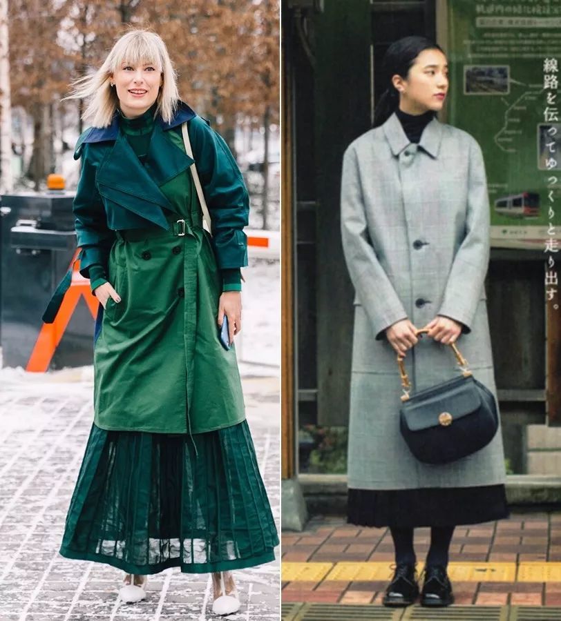 追求质感的小伙伴可以选择丝绸材质的裙子,连风衣都变得浪漫精致起来。▼
