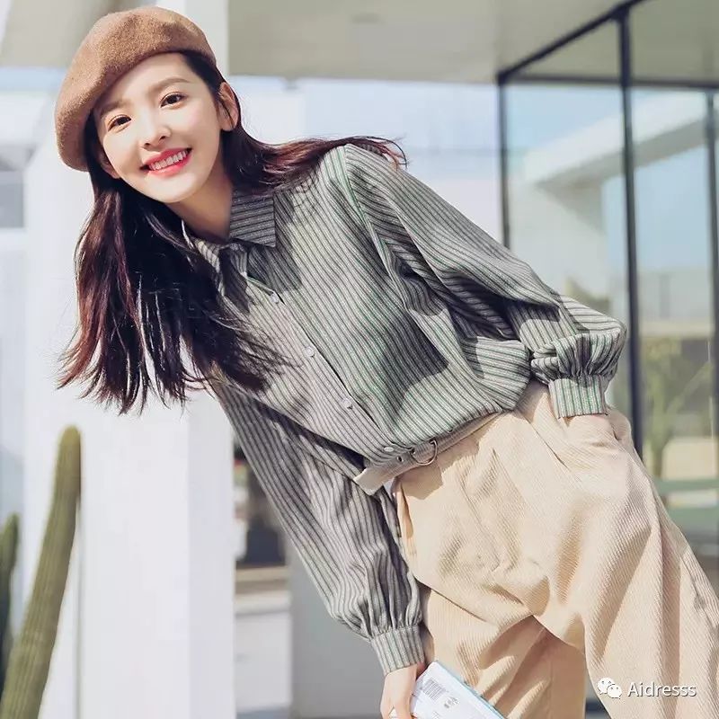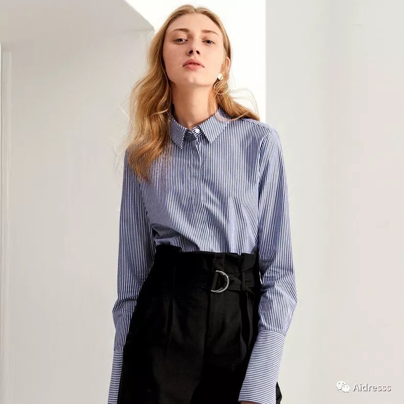 4.蓝色纯棉竖条纹衬衣。经典时尚的蓝条纹元素,有种文艺小清新的气息。无论是未迈出象牙塔的学生妹还是闯荡职场的女强人,穿起衬衣都十分得体大方,仿佛整个人都靠谱了许多呢。