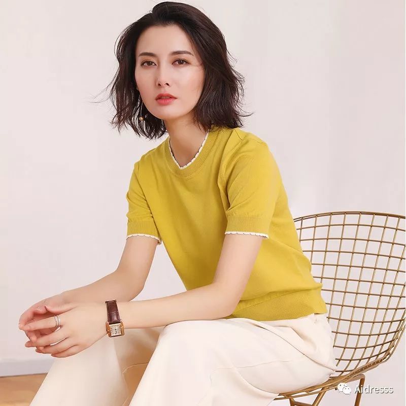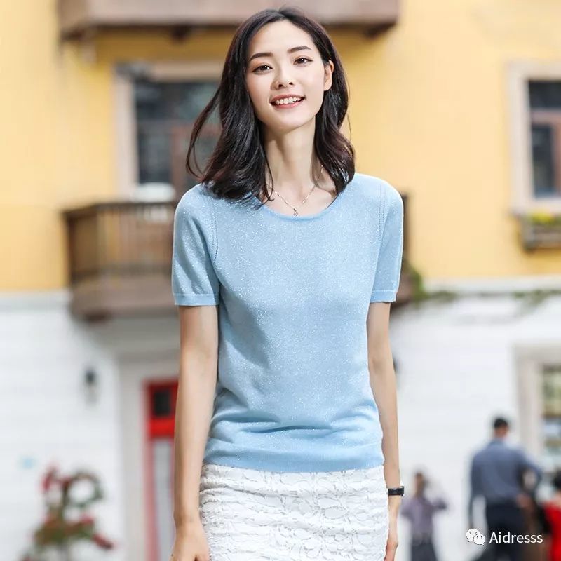 2.洛薇雅短袖针织打底衫。这件针织衫采用莱赛尔面料,手感柔滑,舒适透气,在此基础上还特别用银丝进行混合织造,面料闪烁着低调的光芒。上身很显气质,更有种唯美浪漫的韵味呢。