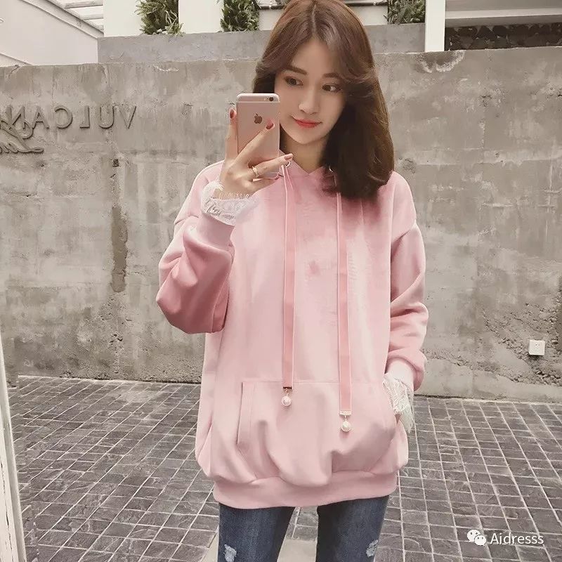7.粉色连帽丝绒卫衣。今年很热门的丝绒,与简约的卫衣碰撞,风格休闲。帽子抽绳设计,绳子底部还有一颗珍珠,很优雅。丝绒面料,手感软糯亲肤。袖口处还拼接了蕾丝的花边,设计感满满。