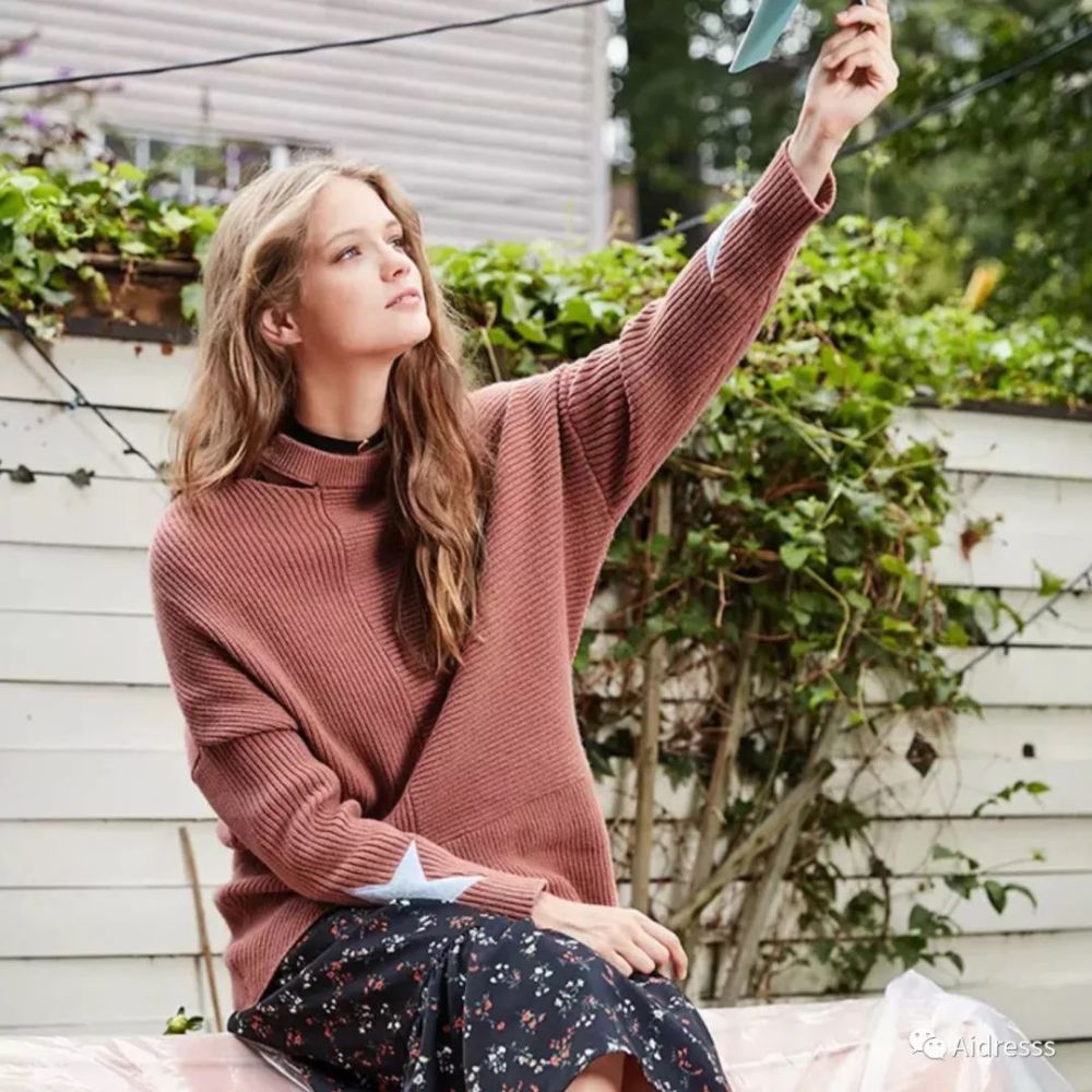 8.镂空打底毛衣针织衫。这件针织衫虽是基本款,但也融入了设计小心思。不规则的下摆,袖口的星星贴布,螺纹镂空圆领设计别出心裁。颜色饱满,宽松显瘦,当打底衫或单穿都很合适。