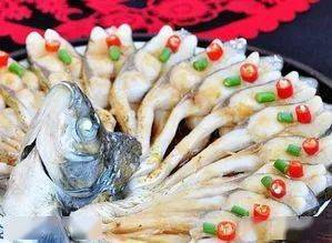 1、盘中首先铺入葱、姜丝,放入鱼,摆成孔雀开屏状,再摆入鱼头和鱼尾,点缀小红辣椒。