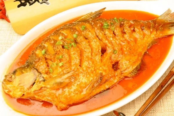 8、炸好的鱼捞出后,趁热放入冷却的酱汁中,泡一会,汤汁浸透后即可。