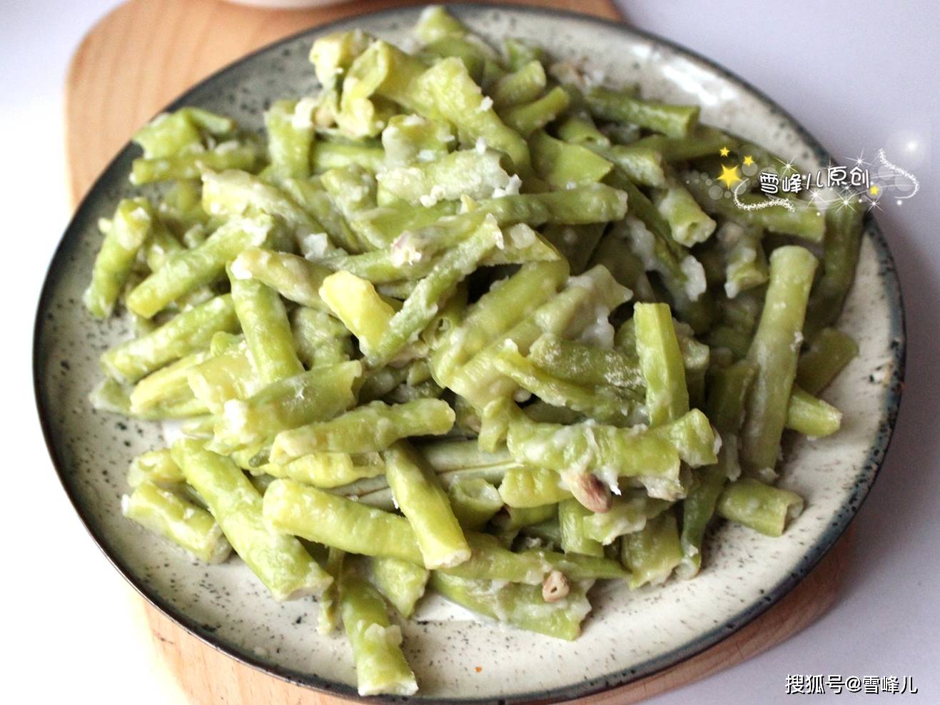 1,老豆角洗净切成段,放到盆里,加入盐和面粉拌匀,这里不需要另外加水,只用清洗豆角自带的水分足矣。