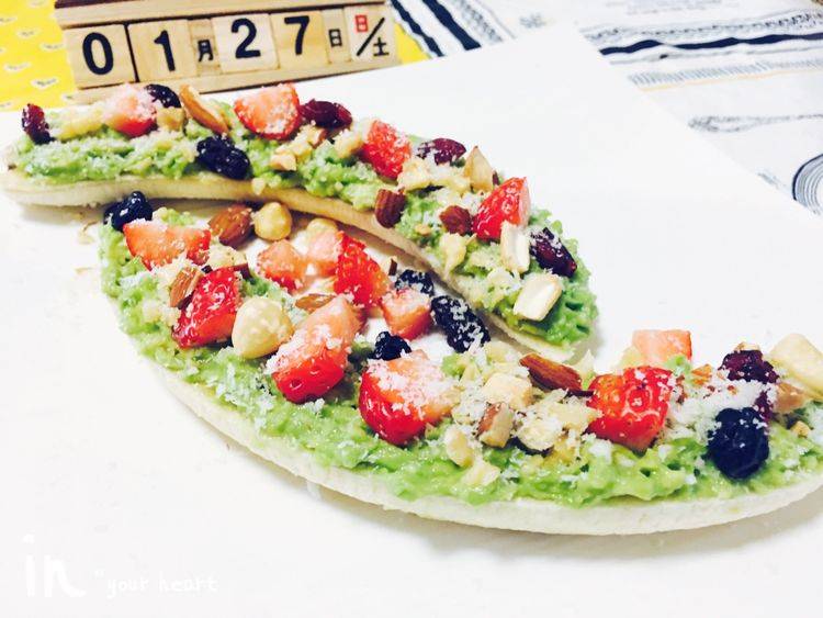 【烹饪食材】:香蕉一根,牛油果一个,草莓5颗,坚果碎一袋,椰蓉适量,蓝莓十个,蔓越莓适量,可以加一些是自己喜欢吃的水果。