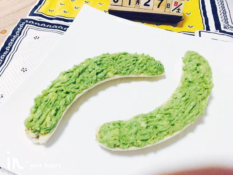 3、按压好的牛油果泥搅拌均匀,没有小块,将牛油果泥用勺子涂抹在香蕉的上面,涂抹均匀,平摊。