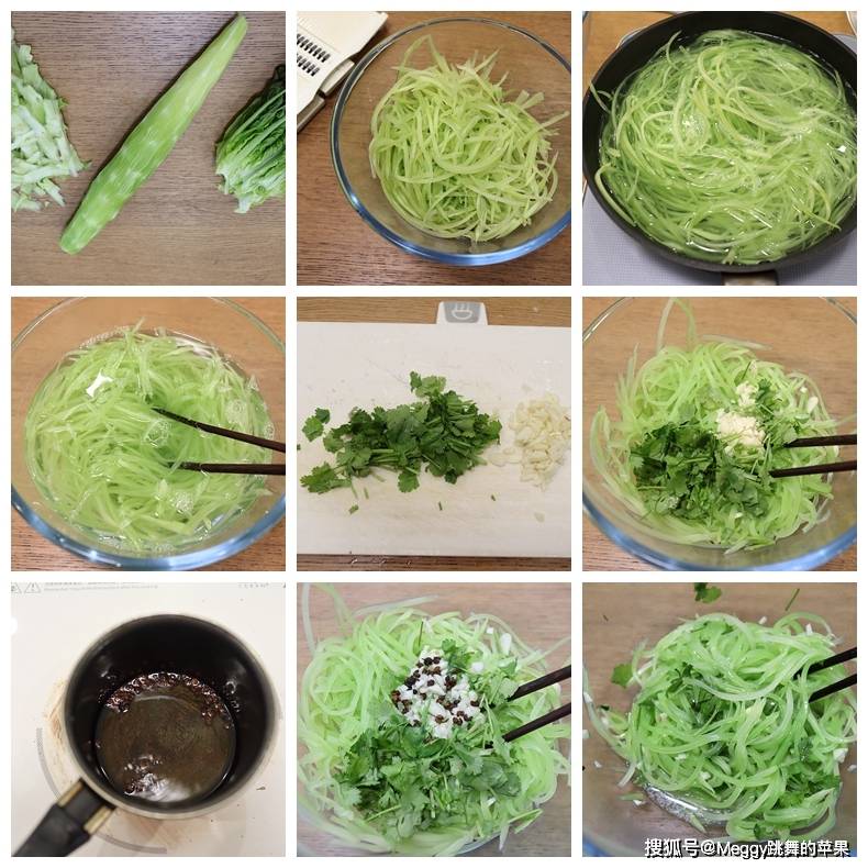 材料: 莴笋1根,香菜2棵,大蒜5瓣,盐2克,白糖6克,鸡粉1克,花椒1撮,植物油10克 1. 莴笋一根,削掉外表; 2. 4. 用擦丝器擦长长的粗丝; 3. 入开水锅中焯烫15秒,立即捞出; 4. 冲凉水,迅速降温,笋丝清脆且翠绿; 5. 大蒜切碎,香菜切寸段; 6. 莴笋丝捞出、控水,入大盆,蒜末、香菜段同入盆中; 7. 花椒入油中烧热出香味; 8. 趁热泼在蒜末上; 9. 撒盐和白糖,拌匀即可食用。