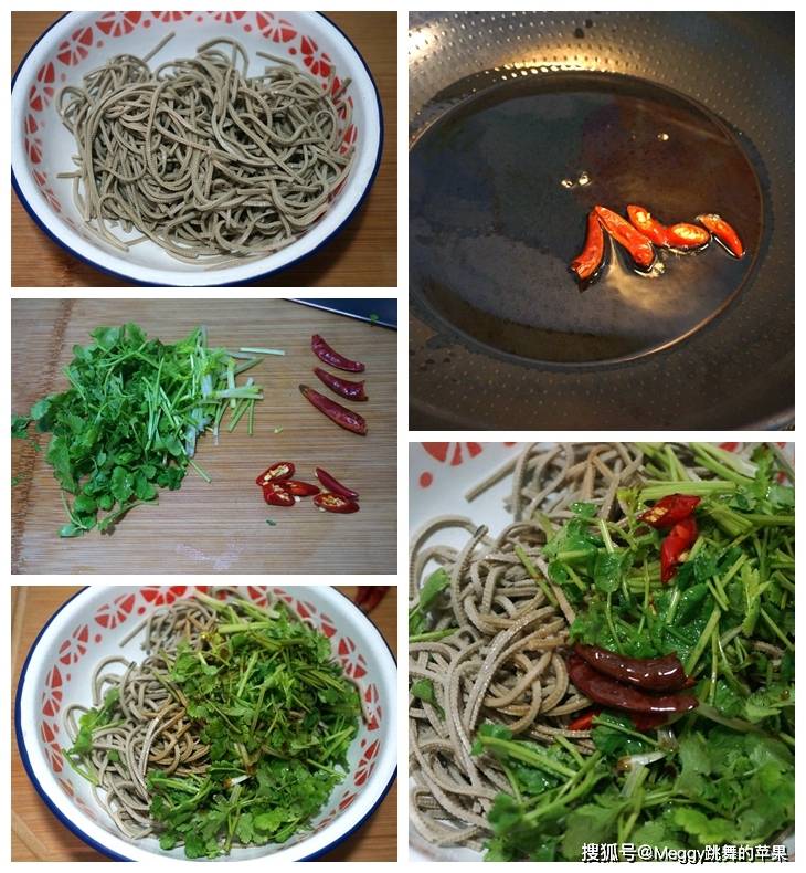 材料:五香豆腐丝1把,香菜3棵,小米椒1个,干红辣椒3个,油少许,生抽少许,盐少许 1. 五香豆腐丝切成7、8公分长,用凉水清洗两遍,去掉多余的盐份; 2. 香菜切成寸段,小米椒切圈; 3. 豆腐丝和香菜同入一碗中,撒适量盐、生抽; 4. 炒锅中倒适量油,将小米椒和干红辣椒入油中煸炒出香味,略变色; 5. 将热油泼在豆腐丝上,拌匀即可。