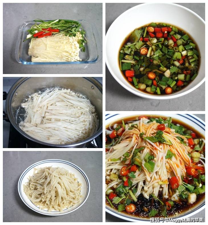 材料:金针菇1把,小米辣4个,香葱2棵,香菜1棵,生抽适量、米醋适量,香油少许,辣椒油适量 1. 金针菇去根,泡凉水中10分钟,小米辣、香葱、香菜洗净; 2. 金针菇分成小撮,入开水锅中,煮到再次沸腾时捞出,自然晾凉; 3. 将金针菇入盘中,中间高四周低; 4. 小米辣切圈,香葱、香菜切小段,同入碗中,倒适量的生抽、米醋、香油,调匀,因为生抽量大,所以不用再放盐了; 5. 将碗汁淋在金针菇上,再舀两大勺辣椒油,味道和口感都非常好。
